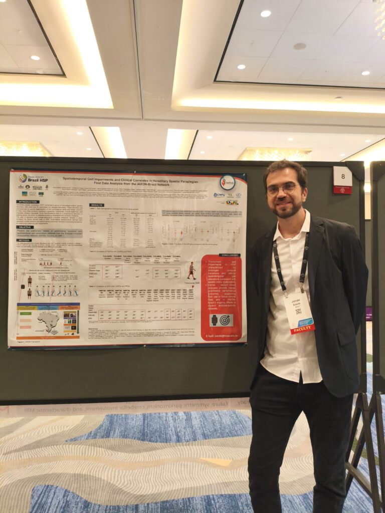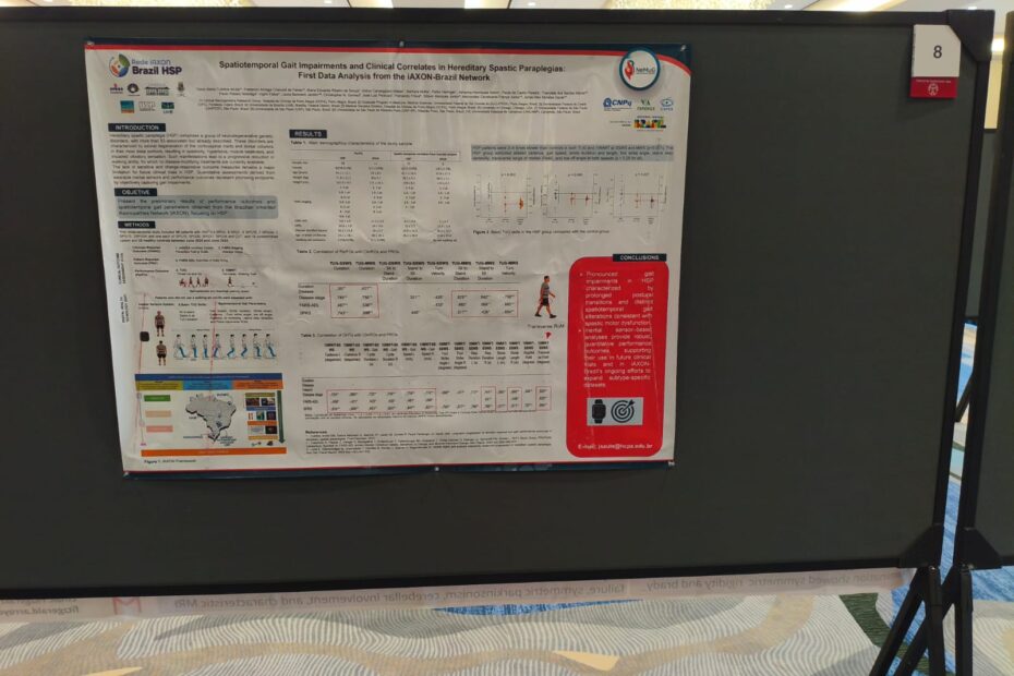 A Rede iAXON-HSP Brazil celebrou uma importante conquista durante o MDS-PAS Congress, realizado em Houston, Texas. O trabalho, que apresenta os achados preliminares sobre desfechos de performance e análise de marcha via sensores vestíveis em pacientes com Paraparesia Espástica Hereditária (PEH), foi selecionado para o prestigiado Guided Poster Tour.